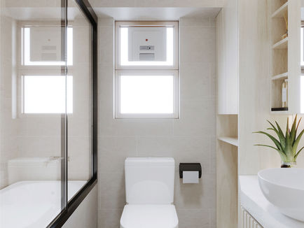 浴室延用淺木色做主色,櫃邊和浴屏使用黑鋼修飾,風格年輕。組合櫃設計簡單實用,更根據戶主習慣鏤空出層架和雜物櫃,以供擺放生活用品。