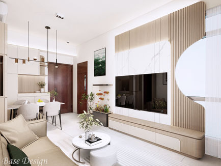 客廳保留大窗戶引入充足的自然光,增強了空間的通透性。電視特色牆是整體空間風格的重要部分,不僅增添了視覺上的層次感,還能夠有序地管理娛樂設備,保持空間的整潔。電視特色牆以大理石搭配淺木紋材質,加入木條子坑紋及弧形的設計,打破傳統直線的僵硬感,提升空間的柔和感。