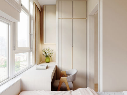 客廳趟門推開後是另一間睡房位置,空間雖然小巧,但設計一點不含糊。床和書桌的佈局很合理,日常休息、工作學習都能滿足。定制的衣櫃設計也是充分地利用了空間。房間的風格設計和整體風格統一,窗戶的自然光跟淺色調的設計讓房間顯得特別乾淨明亮,住起來特別舒服。