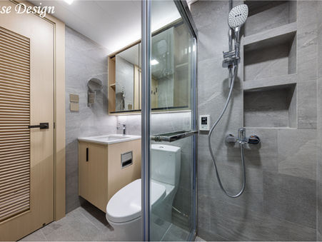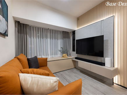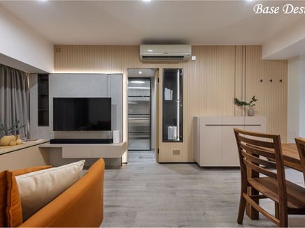 大廳牆身採用淺木色直紋設計,配搭灰色特色電視牆,簡潔劃分客飯廳,令整個空間乾淨舒服。