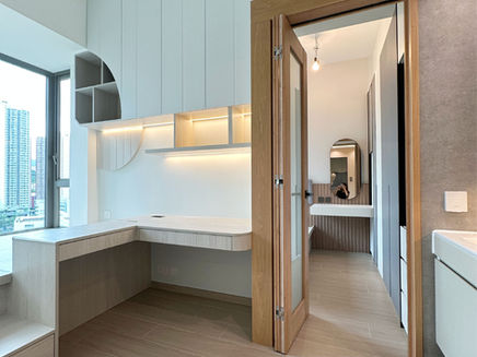 開放式書房配備一張L型大書枱,令到主人辦公學習更舒心。書枱上方設計吊櫃和書架,方便主人擺放書籍,裝飾品。靠窗處設計儲物式地台,上方放置一張軟墊沙發,方便主人隨時享受日光,閱讀休息。