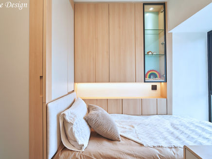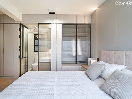 主人房以淺木, 白色為主, 設計地台儲物,及三邊落床。窗台位置牆身加上淺木飾面板,把風格及視角更統一,給予舒適的自然感覺。高身入櫃衣櫃,使用了長虹玻璃與櫃體融合,帶出通透感,兼具美觀及收納,隱藏式設計讓空間整體感覺更加整潔。窗台休憩區,放置舒適cushion,戶主可以在此寫意閱讀,休息,眺望窗外風景。