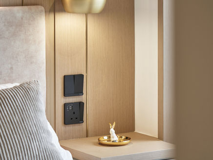 床頭位置特飾牆上加上嵌入式LED燈帶,直身燈光有助拉長空間。床側有裝飾吊燈,加上地台邊的裝飾燈帶,令整個房間的層次更加豐富且溫馨。