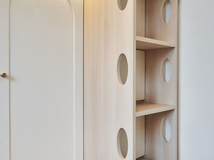 客房的設計主調也是淺木色系,設有衣櫃連開放式書櫃及玻璃飾櫃,一體櫃的設計既節省空間同時通透的玻璃飾櫃擺放小擺設後也不會顯得設計過於單一沉悶。床邊的抽屜式收納櫃也滿足了日常的收納需求。