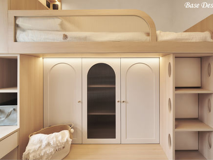 上層床鋪、下層收納及功能區的設計為小戶型房間節省了空間。床頭位置小書櫃,方便小孩子擺放睡前讀物,樓梯櫃亦可擺放玩具,衣物的收纳需求。