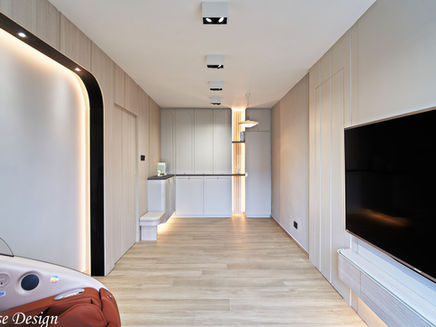 客廳位置設有灰色特色牆,加上延伸的淺木飾板,及燈光效果,營造層次感。電視機位置設有白色飾面牆身,配淺木色電視矮櫃,懸空櫃底擺放日常用品。