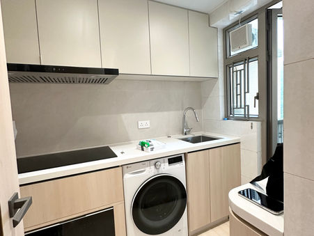 廚房用色年輕,使用米白和灰色。電器採用入櫃設計,令到空間更和諧。部份吊櫃改為現代感的灰框玻璃櫃面,以放大空間感。