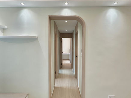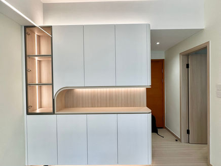 玄關位特色牆附鏡子和掛衣位,方便主人出門時打扮。飯廳儲物櫃櫃面以條子修飾。內側打造氛圍感玻璃飾物櫃。客飯廳設計假天花配合燈光照明,增添現代感。另一面牆身窗戶位置設計與牆身同色的半腰鞋櫃,以減少窗戶的突兀感。