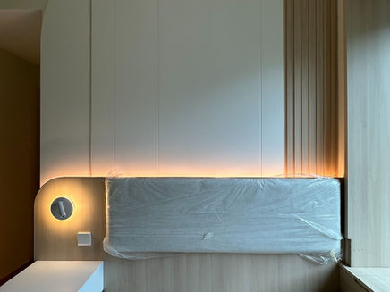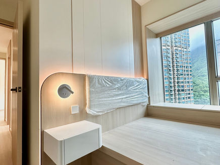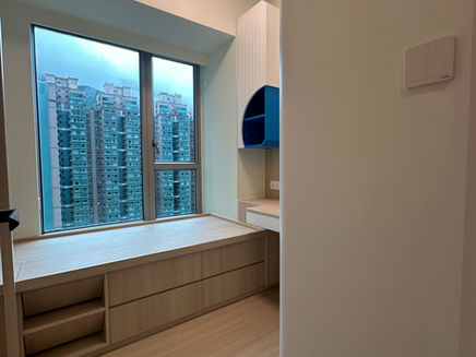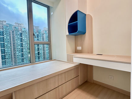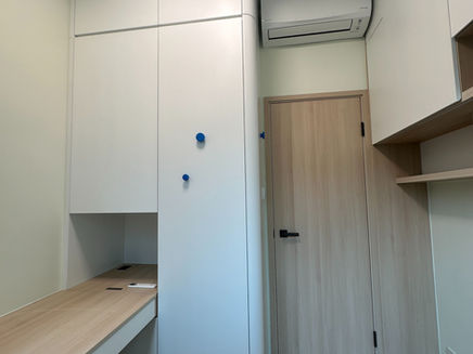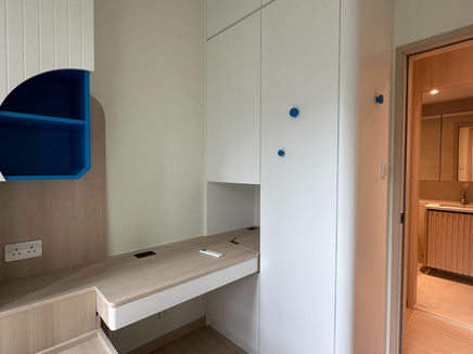 睡房相較主人房更加年輕有活力。線條設計更為利落,以及加入亮色的物件改變氛圍感。門口位大型衣櫃櫃身加入圓型掛鉤,方便主人掛外套、包包。牆身小型吊櫃修飾了柱的不美觀。