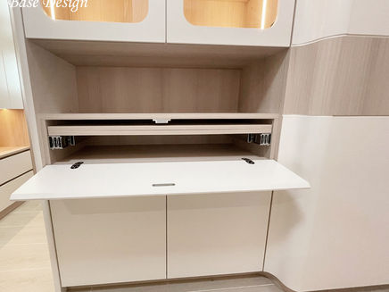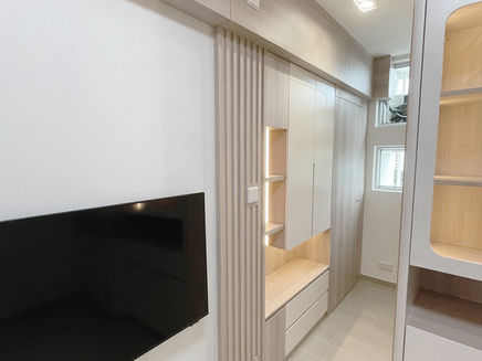 設計師於客廳間了兩間細房,牆身主要選用淺色橡木材料做隔間,增強了室內空間感;為了減少櫃體帶來的視覺壓迫感,將電視機掛在牆上, 訂造落地兩桶矮櫃,牆身加入黑坑直紋木條裝飾,有助拉高整體空間視覺效果;相連半開放式的入牆儲物櫃,具有收納機能同時可用作展示裝飾品,加入隱藏燈帶營造出溫馨而不刺眼的照明效果;淺色橡木材質從儲物櫃延伸至主人房門,將房門自然融入,讓視覺上看起來更加寬敞。