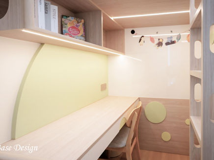 睡房則以淺木紋和白色為主色,採用上下層設計:上層床架和下層衣櫃或放置書桌,使房間的空間更有效地使用。